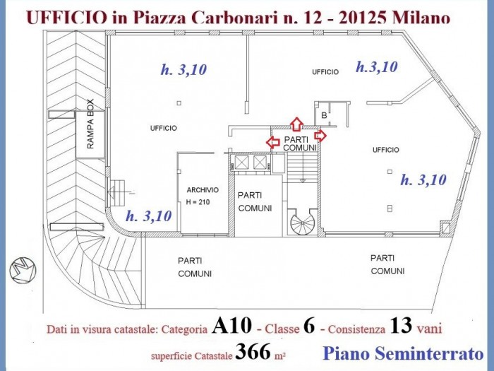 Piazza Carbonari n. 12, a soli 600 metri dalla Linea M3 (Linea Gialla), fermata Sondrio. In Stabile anni '60 con servizio di portineria mezza giornata. Proponiamo in VENDITA, 2 UFFICI LIBERI, entrambi con TRE ingressi e posti: Piano Seminterrato mq 370 circa, H 3,10. Con i seguenti dati Catastali: Zona Censuaria 2- Categoria A10 - Classe 6- Consistenza 13 vani - Superficie Catastale 366 m² - Rendita Catastale Euro 9.198,10. Piano RIALZATO mq 300 circa, H 3,10. Con i seguenti dati Catastali: Zona Censuaria 2- Categoria A10 - Classe 7- Consistenza 10 vani - Superficie Catastale 298 m² - Rendita Catastale Euro 8.237,49. Immobili facilmente frazionabili in più unità. Distribuiti come raffigurato nelle planimetrie presente nell'immagini. Per informazione 338 26 76 034 Agente Immobiliare Francesco Berretta Devi VENDERE o AFFITTARE UN IMMOBILE? Chiedi una VALUTAZIONE GRATUITA SENZA IMPEGNO. vai su: ttp://www.dueffeimmobili.it/web/scouting.asp?ric_controllo=o&pagref=52691&source=