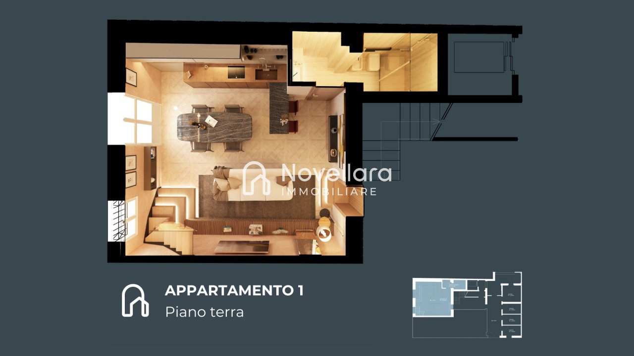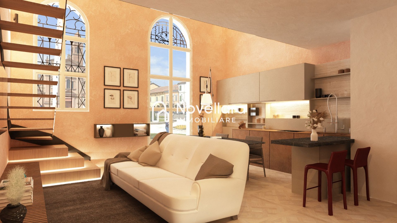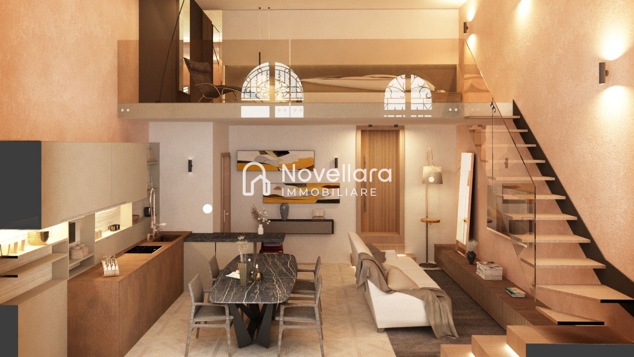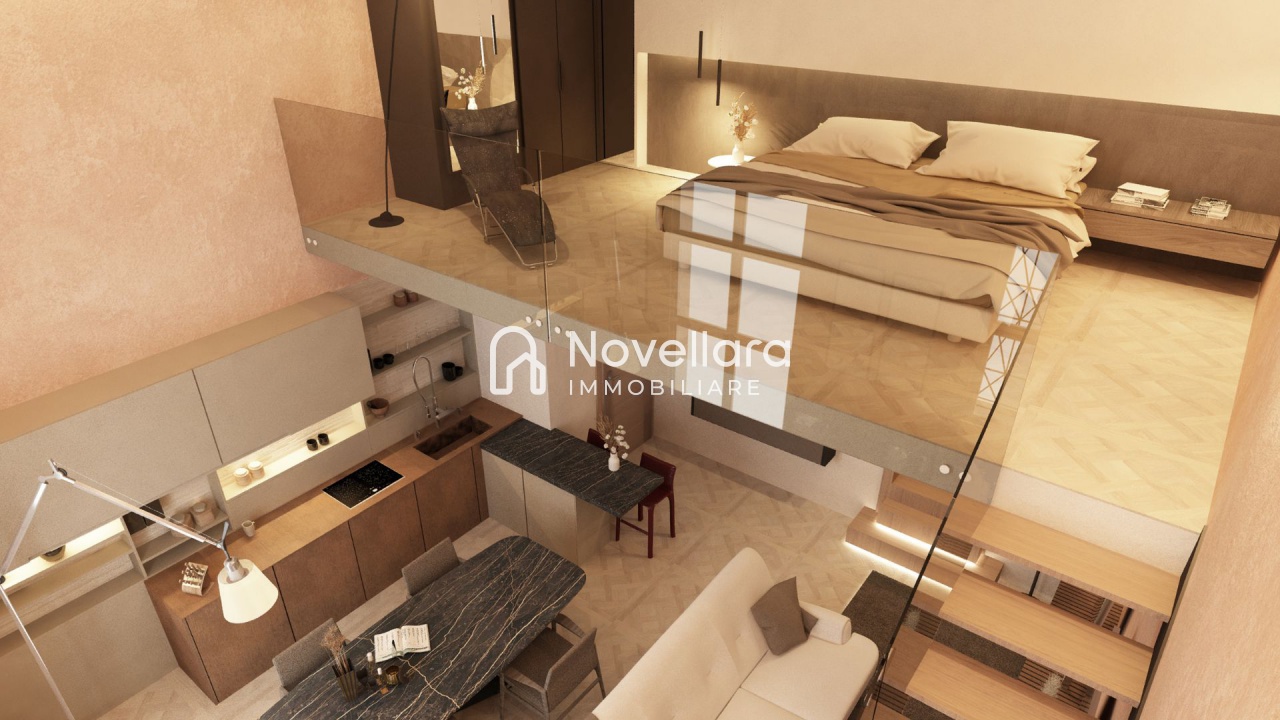 Fronte Piazza, in uno dei contesti più prestigiosi di nuova e totale ristrutturazione, splendido loft su due livelli con ampie vetrate sulla piazza composto da al piano terra ampio salone con cucina open space, antibagno e bagno, con una moderna scala in legno e vetro si arriva al piano soppalcato dove troviamo un ampia camera matrimoniale con cabina armadio o ripostiglio. Finiture di pregio e accessori moderni e tecnologie per il risparmio energetico rendono questo appartamento un vero gioiello affacciato sulla splendida piazza di Novellara. Classe Energetica: A3 - IPE: 0.00kWh/mq anno