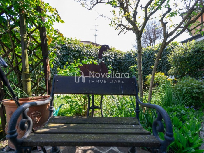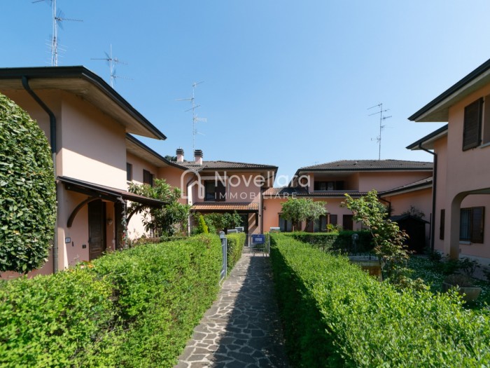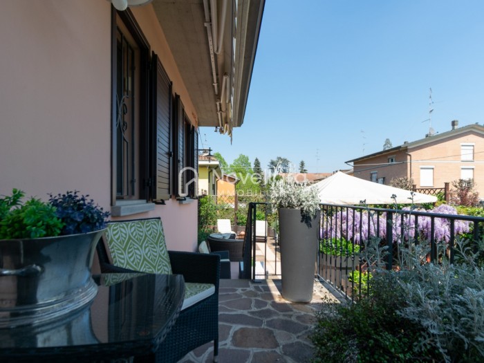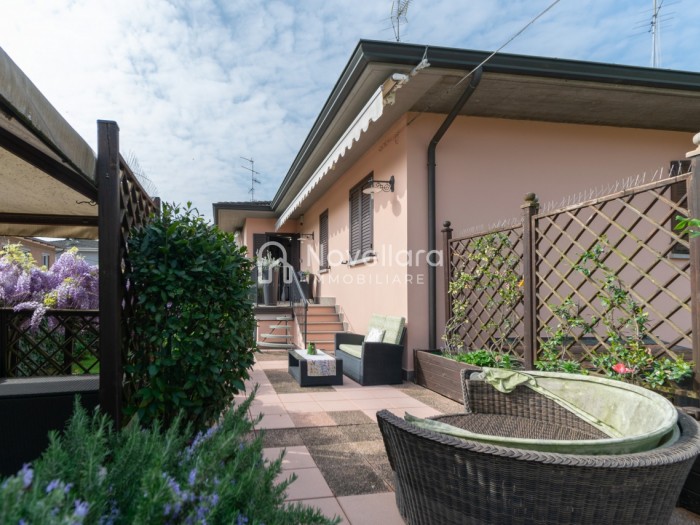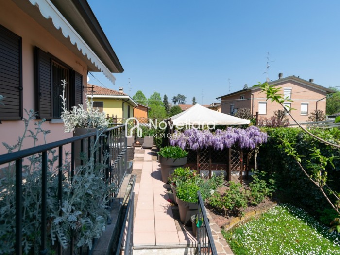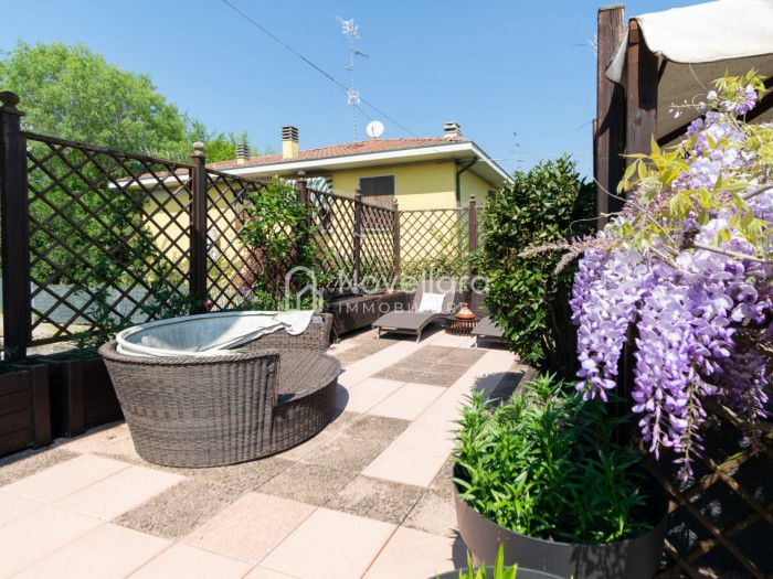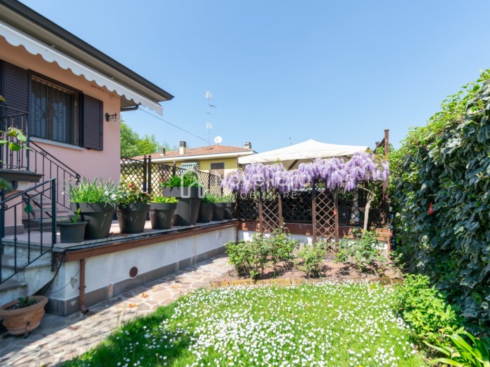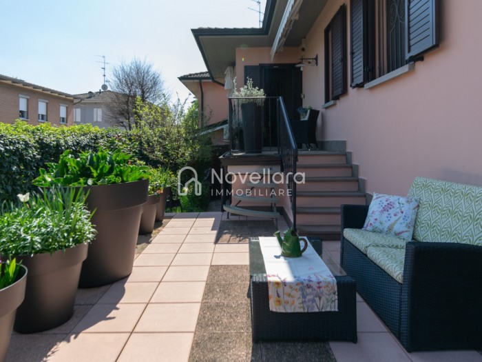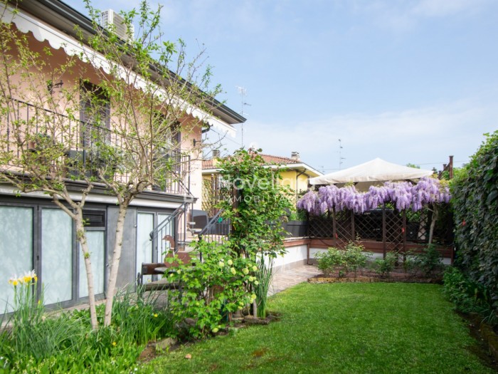 In splendida e tranquilla zona residenziale, proponiamo villetta a schiera disposta su due piani, con grande e riservato spazio esterno. L'immobile si organizza su ampio ingresso che ti conduce al piano primo su luminoso soggiorno con zona pranzo, cucina separata, bagno e camera matrimoniale. Attraverso il soggiorno si esce su un spazioso cortile completamente attrezzato con gazebo in legno, area barbecue e arredi relax, a fianco un grazioso giardino contornato da alta siepe che conferisce la giusta privacy e tranquillità. Al piano di sotto troviamo la seconda camera da letto matrimoniale con cabina armadio, servita da un comodo bagno. La proprietà si completa con zona lavanderia, cantina e grande autorimessa di 26mq. L'immobile viene venduto completamente accessoriato di mobilio fatto su misura, impianto d'allarme, condizionamento, irrigazione automatica, sistema di protezione zanzare perimetrale, tende da sole con sistema anti-vento e tutte le strutture in legno per esterni. Questa casa è stata valorizzata con il servizio di Home Staging, a cura di Sara Brunazzi. Classe Energetica: - - IPE: 0.00kWh/mq anno