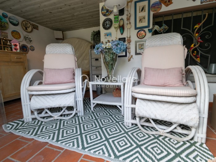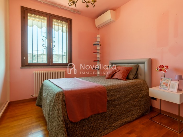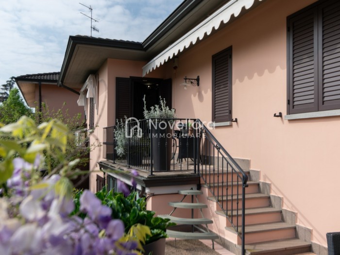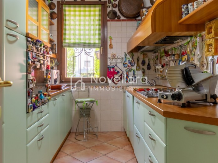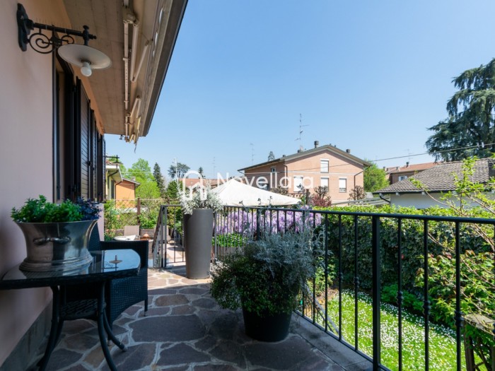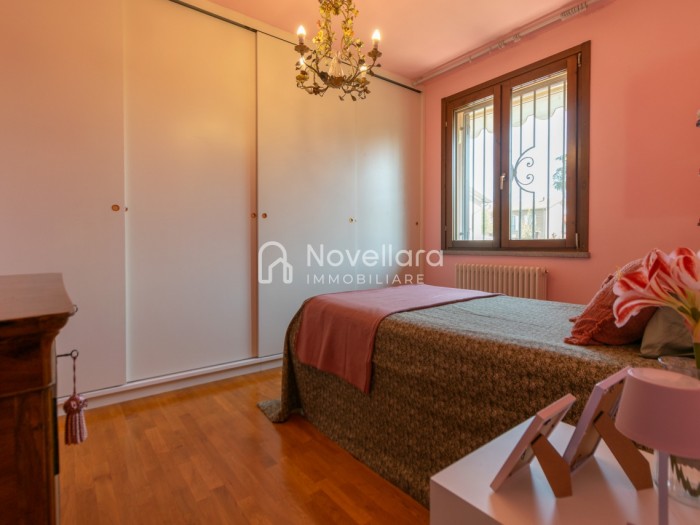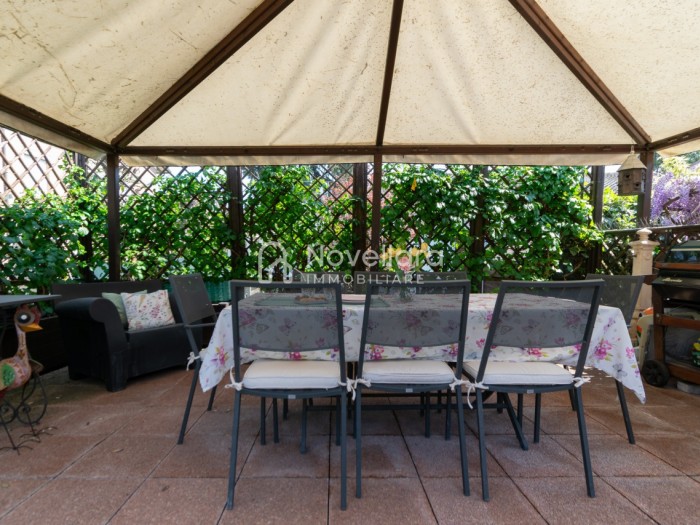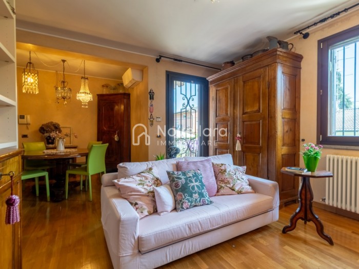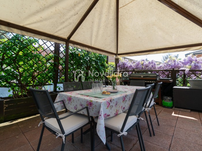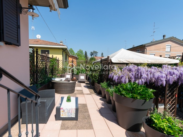 In splendida e tranquilla zona residenziale, proponiamo villetta a schiera disposta su due piani, con grande e riservato spazio esterno. L'immobile si organizza su ampio ingresso che ti conduce al piano primo su luminoso soggiorno con zona pranzo, cucina separata, bagno e camera matrimoniale. Attraverso il soggiorno si esce su un spazioso cortile completamente attrezzato con gazebo in legno, area barbecue e arredi relax, a fianco un grazioso giardino contornato da alta siepe che conferisce la giusta privacy e tranquillità. Al piano di sotto troviamo la seconda camera da letto matrimoniale con cabina armadio, servita da un comodo bagno. La proprietà si completa con zona lavanderia, cantina e grande autorimessa di 26mq. L'immobile viene venduto completamente accessoriato di mobilio fatto su misura, impianto d'allarme, condizionamento, irrigazione automatica, sistema di protezione zanzare perimetrale, tende da sole con sistema anti-vento e tutte le strutture in legno per esterni. Questa casa è stata valorizzata con il servizio di Home Staging, a cura di Sara Brunazzi. Classe Energetica: - - IPE: 0.00kWh/mq anno